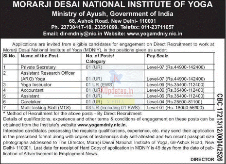 Applications are invited from eligible candidates for engagement on Direct Recruitment to work at Morarji Desai National Institute of Yoga (MDNIY), in the positions given as under: