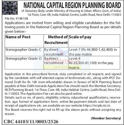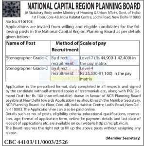 Application in the prescribed format, duly completed in all respects and signed by the candidate with self-attested copies of testimonials etc., along with IPO/ Demand Draft for Rs 100 (non-refundable) drawn in favour of NCR Planning Board payable at New Delhi towards Application Fee should reach the Member Secretary, NCR Planning Board, 1st Floor, Core-4B, India Habitat Centre, Lodhi Road, New Delhi-110003. The Application Fee can also be paid online.