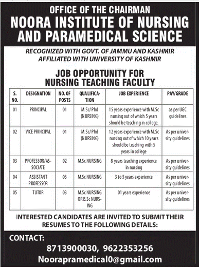 Job Experience: 15 years experience with M.Sc Nursing, out of which 5 years should be teaching in a college
