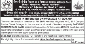 Recruitment in PM Shri Kendriya Vidyalaya No. 3 Srinagar