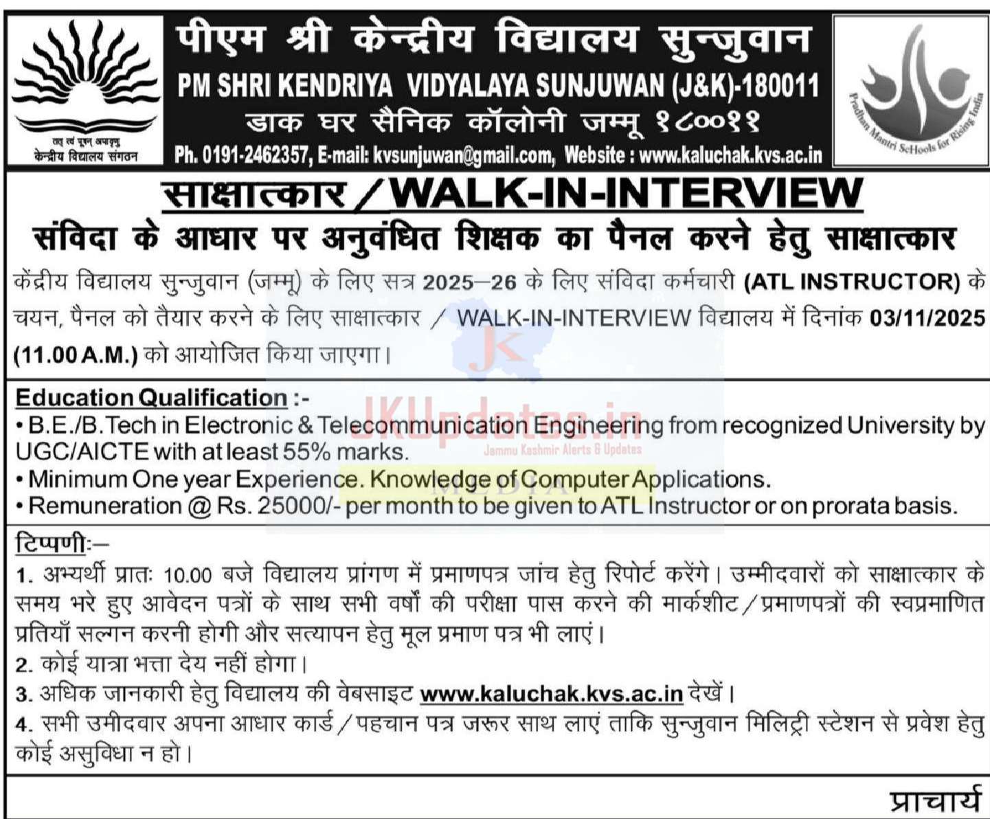 Recruitment in PM Shri Kendriya Vidyalaya Sunjuwan
