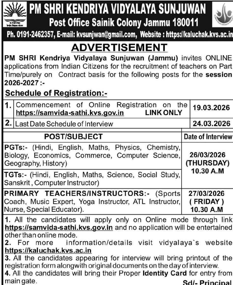 PM SHRI Kendriya Vidyalaya Sunjuwan (Jammu) invites ONLINE applications from Indian citizens for the recruitment of teachers on Part Time / purely on Contract basis for the following posts for the session 2026–2027.