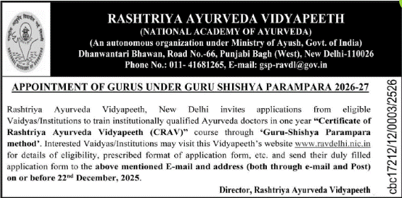 Interested Vaidyas/Institutions may visit this Vidyapeeth’s website www.ravdelhi.nic.in for details of eligibility, prescribed format of application form, etc. and send their duly filled application form to the above mentioned E-mail and address (both through e-mail and post) on or before 22nd December, 2025.