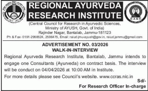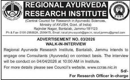 Regional Ayurveda Research Institute, Bantalab, Jammu intends to engage one Consultants (Ayurveda) on contract basis.