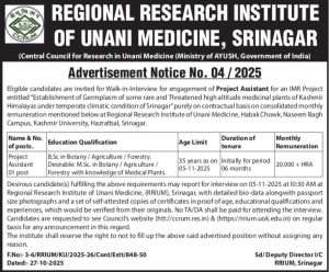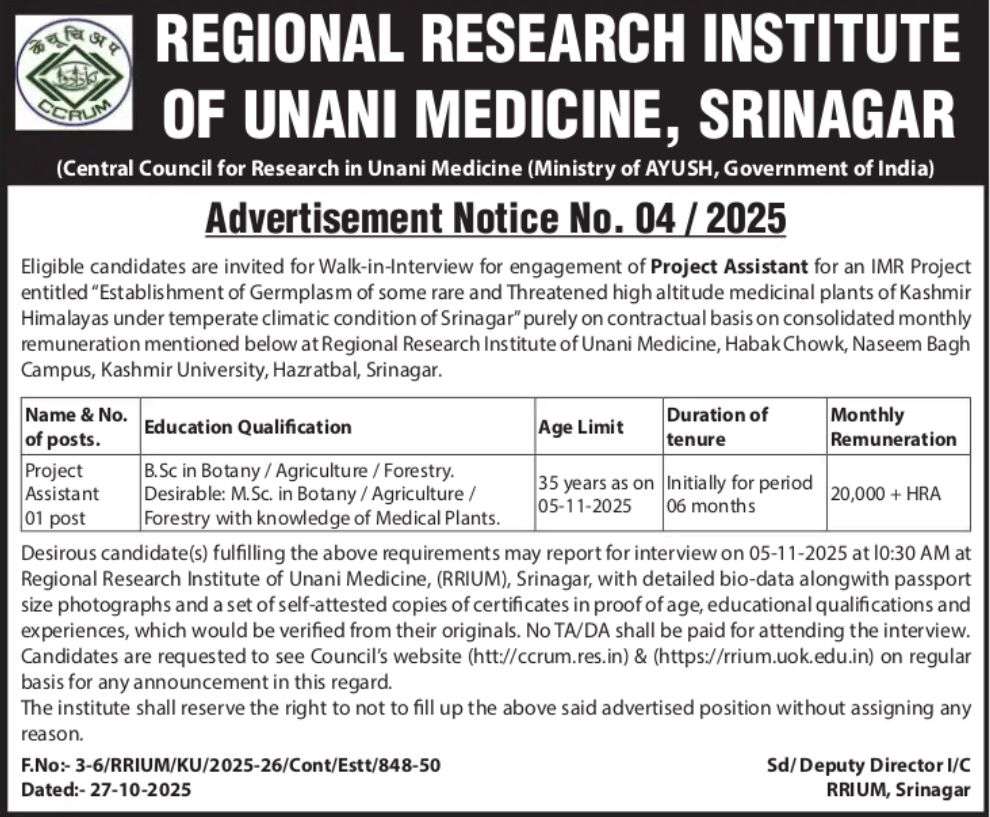 Desirous candidate(s) fulfilling the above requirements may report for interview on 05-11-2025 at 10:30 AM at Regional Research Institute of Unani Medicine (RRIUM), Srinagar, with detailed bio-data along with passport size photographs and a set of self-attested copies of certificates in proof of age, educational qualifications and experiences, which would be verified from their originals. No TA/DA shall be paid for attending the interview. Candidates are requested to see Council’s website (http://ccrum.res.in) and (https://rrium.uok.edu.in) on regular basis for any announcement in this regard.