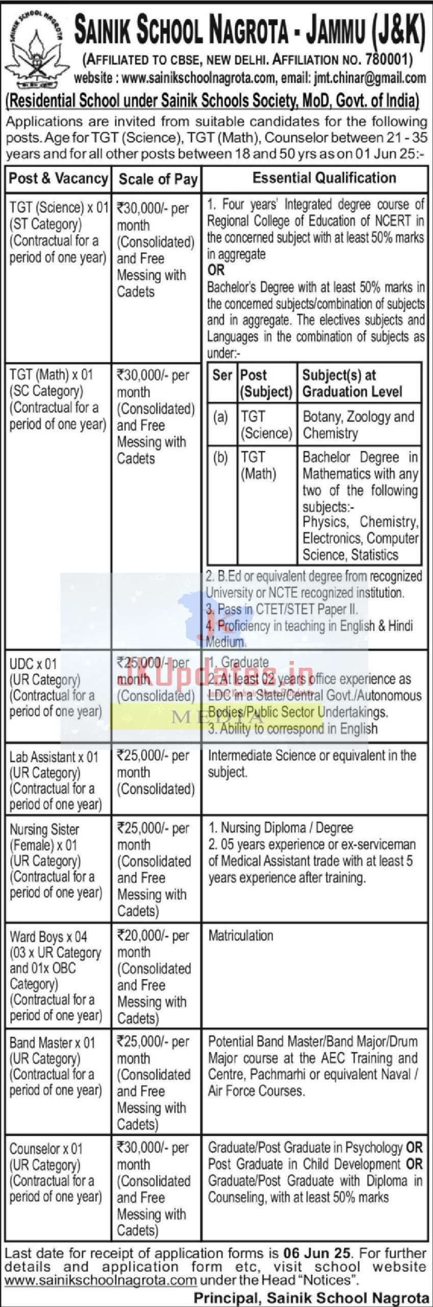 Applications are invited from suitable candidates for the following posts. Age for TGT (Science), TGT (Math), Counselor between 21 – 35 years and for all other posts between 18 and 50 yrs as on 01 Jun 25 :-