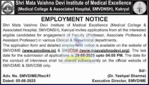 Shri Mata Vaishno Devi Institute of Medical Excellence (Medical College & Associated Hospital, SMVDNSH), Kakryal invites applications from all the interested eligible candidates for engagement of Faculty (Professor, Associate Professor & Assistant Professor) in various Clinical & Non-clinical departments.