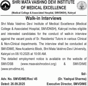 Shri Mata Vaishno Devi Institute of Medical Excellence (Medical College & Associated Hospital, SMVDNSH), Kakryal invites eligible and interested candidates for the conduct of walk-in interview against the vacant posts of Sr. Residents/ Tutors in various Clinical & Non-Clinical departments.
