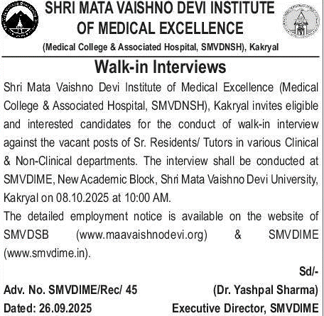 Shri Mata Vaishno Devi Institute of Medical Excellence (Medical College & Associated Hospital, SMVDNSH), Kakryal invites eligible and interested candidates for the conduct of walk-in interview against the vacant posts of Sr. Residents/ Tutors in various Clinical & Non-Clinical departments.