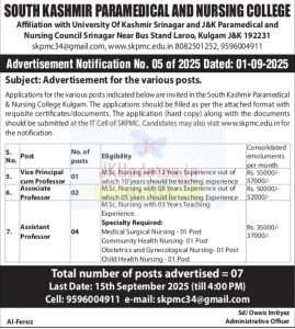 Applications for the various posts indicated below are invited in the South Kashmir Paramedical & Nursing College Kulgam.
