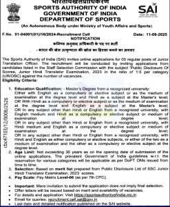The Sports Authority of India (SAI) invites online applications for 05 regular posts of Junior Translation Officer.