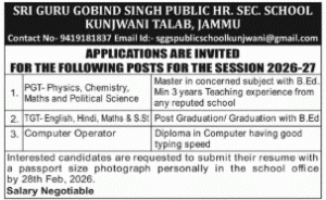 Recruitment in SRI GURU GOBIND SINGH PUBLIC HR. SEC. SCHOOL