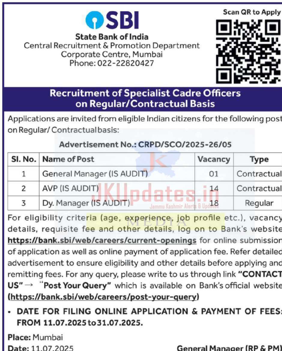 | 1 | General Manager (IS AUDIT) | 01 | Contractual |