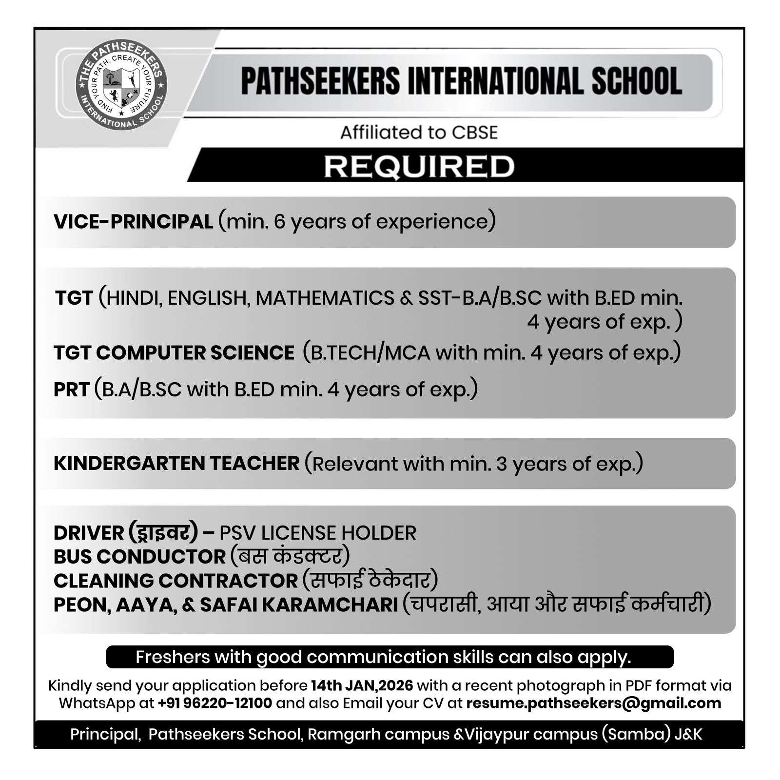 Kindly send your application before 14th January, 2026 along with a recent photograph in PDF format via WhatsApp at +91 96220-12100