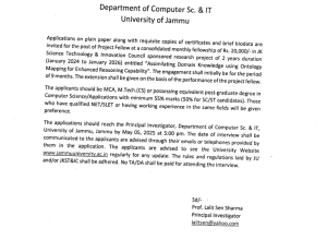 Applications on plain paper along with requisite copies of certificates and brief biodata are invited for the post of Project Fellow at a consolidated monthly fellowship of Rs. 20,000/- in JK Science Technology & Innovation Council sponsored research project of 2 years duration (January 2024 to January 2026) entitled “Assimilating Domain Knowledge using Ontology Mapping for Enhanced Reasoning Capability”.