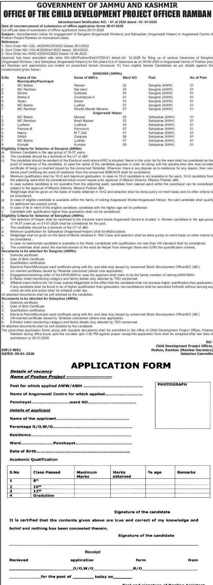 Approval has been accorded vide letter NO:-MD/Poshan/Estt/47253-61 dated:-24- 12-2025 for filling up of various Vacancies of Sanginis (Anganwadi Workers ) and Sahayikas (Anganwadi Helpers) for 5th phase Out of Vacancies as on 30-09-2025 in Anganwadi Centres of Poshan project Ramban and applications are invited on prescribed format (Annexure ‘A’) from eligible female Candidates as per details against the location/ward given below:-