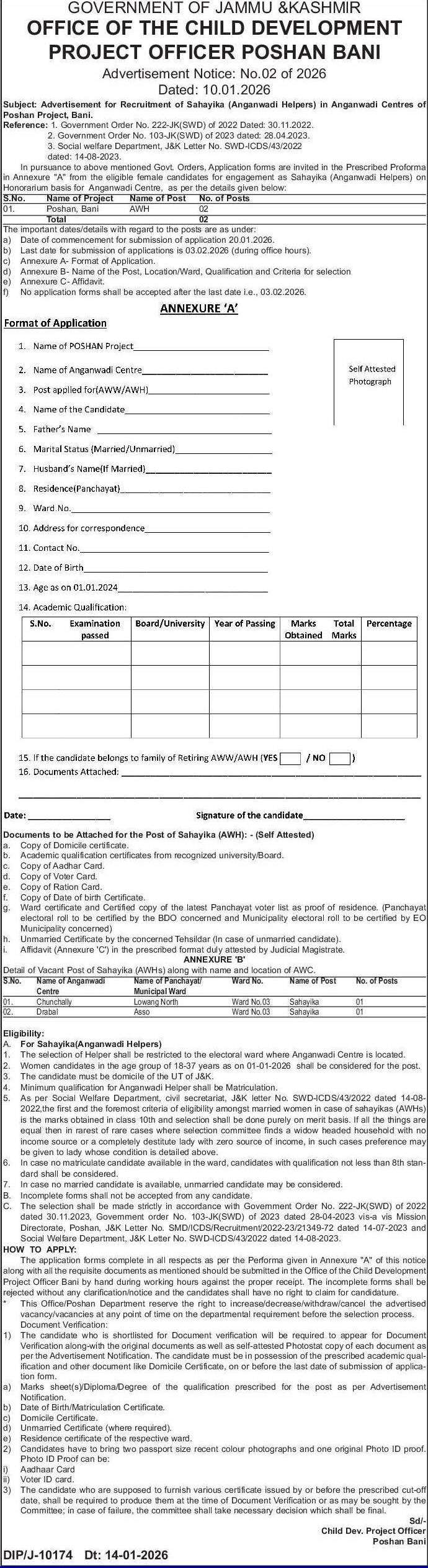 The application forms complete in all respects as per the Performa given in Annexure “A” of this notice along with all the requisite documents as mentioned should be submitted in the Office of the Child Development Project Officer Bani by hand during working hours against the proper receipt. The incomplete forms shall be rejected without any clarification/notice and the candidates shall have no right to claim for candidature.