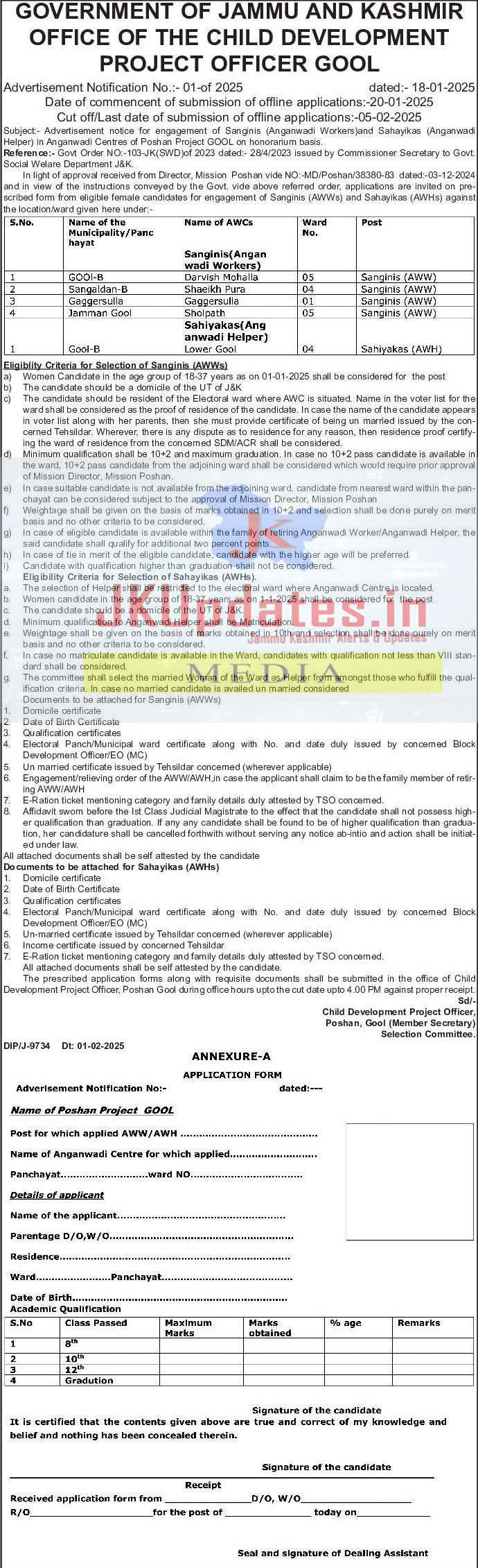 The prescribed application forms along with requisite documents shall be submitted in the office of Child Development Project Officer, Poshan Gool during office hours upto the cut date upto 4.00 PM against proper receipt.
