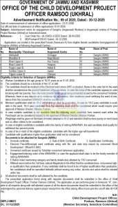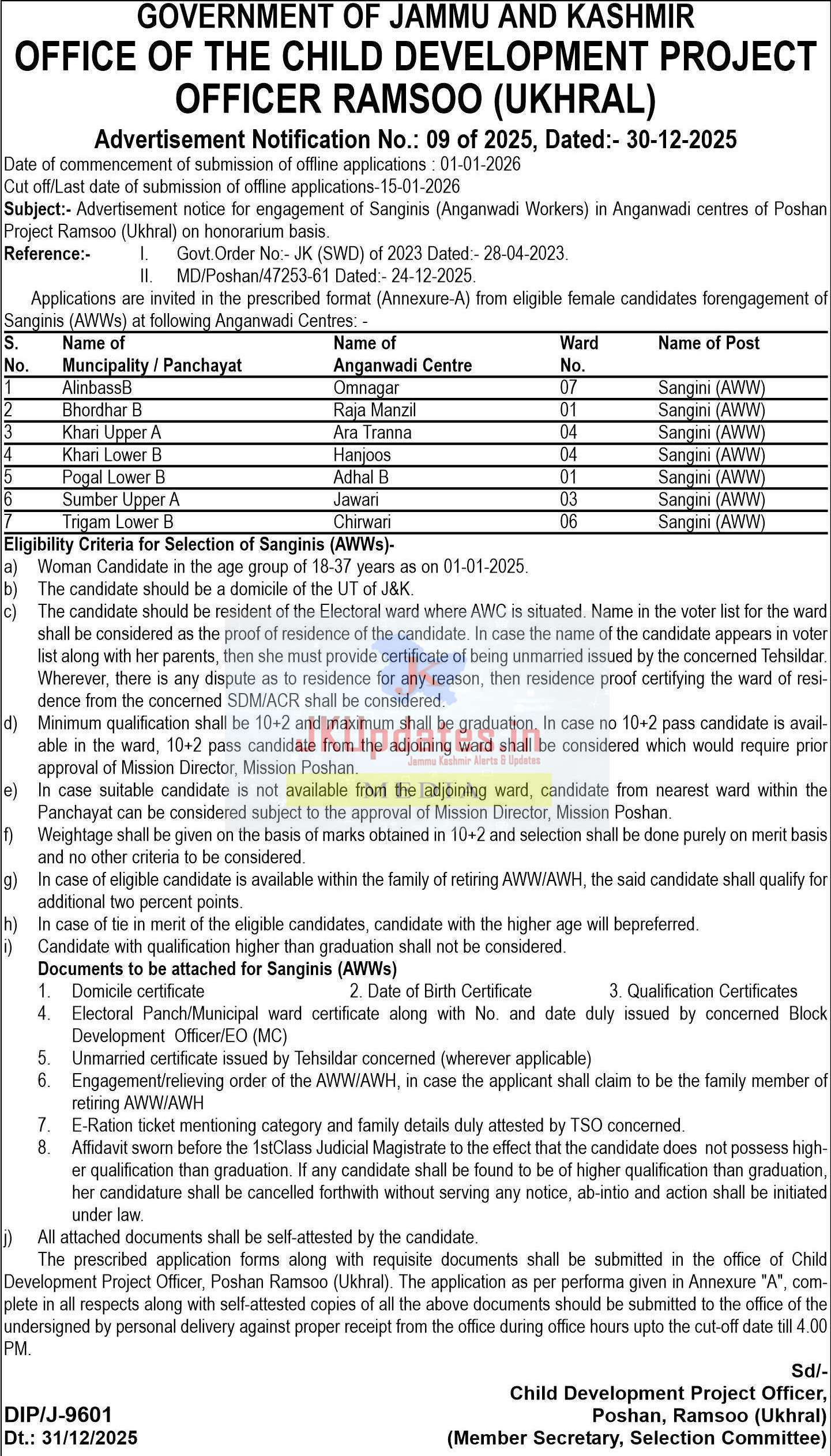 Advertisement notice for engagement of Sanganis (Anganwadi Workers) in Anganwadi Centres of Poshan Project Ramsoo (Ukhral) on honorarium basis.