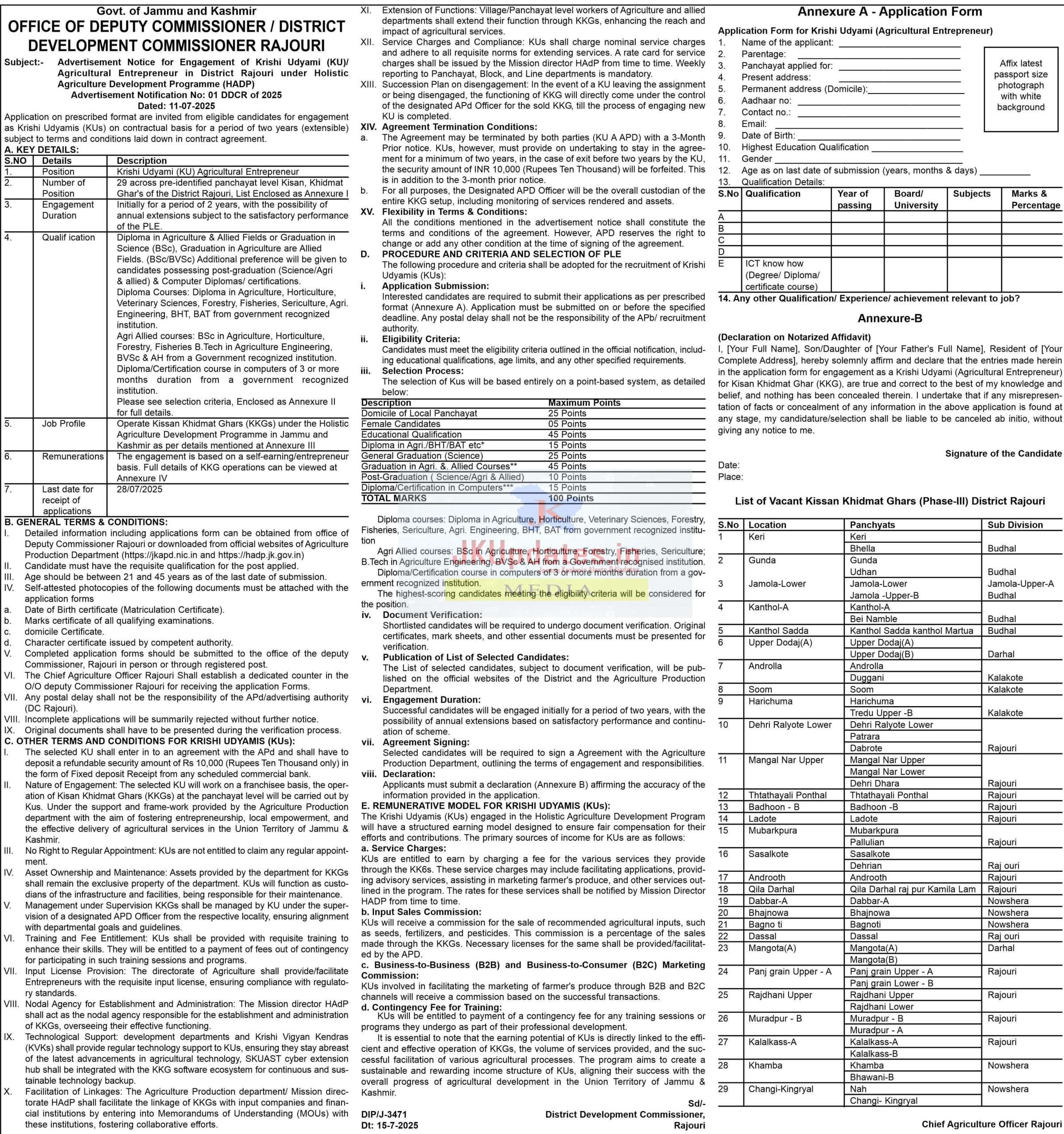 Advertisement Notice for Engagement of Krishi Udyami (KU)/Agricultural Entrepreneur in District Rajouri under Holistic Agriculture Development Programme (HADP)