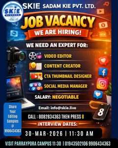 Disclaimer by JKUpdates : Readers are recommended to make all enquiries and seek appropriate advice before acting on any Job Posts published on our Platform . Any subscriber sending money, incurring any expenses or entering into any commitment in relation to any Job Post published on our Platform shall do so entirely at his/ her discretion, intelligence and risk.