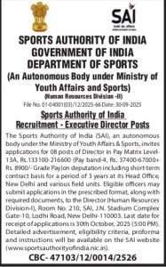 Detailed advertisement, eligibility criteria, proforma and instructions will be available on the SAI website (www.sportsauthorityofindia.nic.in).