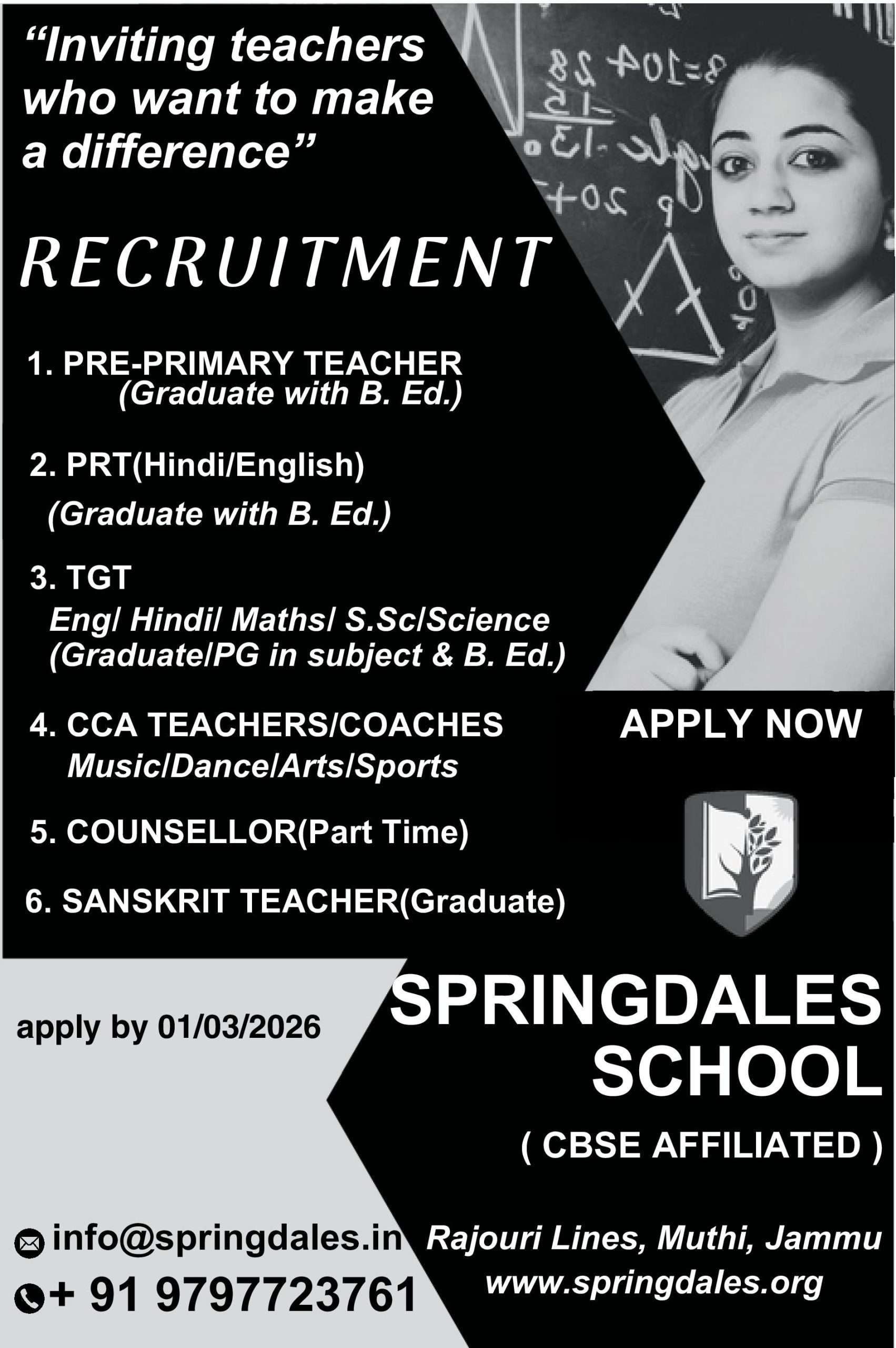 Springdales School, Rajouri Lines, Muthi, Jammu has invited applications for various teaching and non-teaching posts. The school is inviting teachers who want to make a difference.