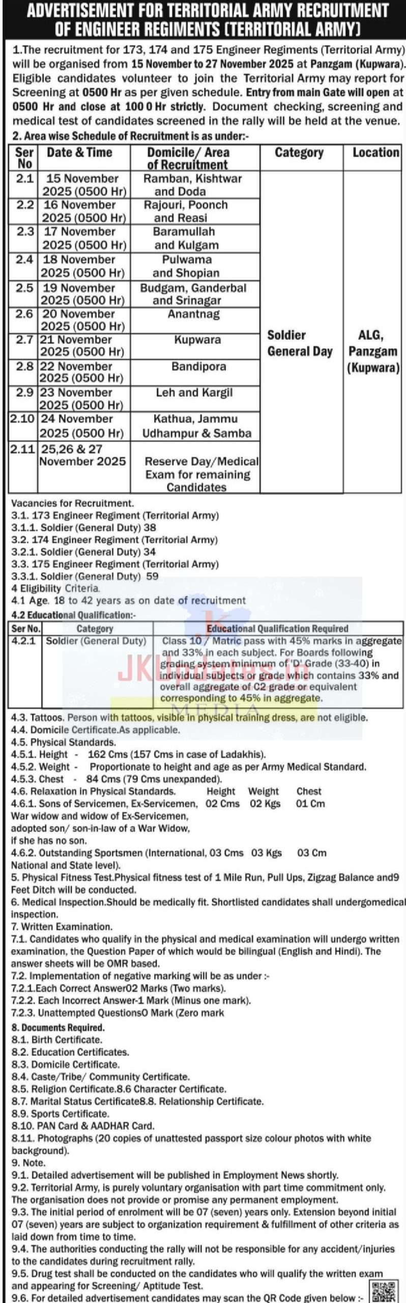 The recruitment for 173, 174 and 175 Engineer Regiments (Territorial Army) will be organised from 15 November to 27 November 2025 at Panzgam (Kupwara).