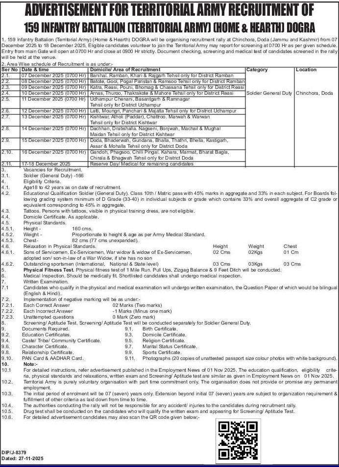 1. 159 Infantry Battalion (Territorial Army) (Home & Hearth) DOGRA will be organising recruitment rally at Chinchora, Doda (Jammu and Kashmir) from 07 December 2025 to 18 December 2025, Eligible candidates volunteer to join the Territorial Army may report for screening at 0700 Hr as per given schedule. Entry from main Gate will open at 0700 Hr and close at 0900 Hr strictly. Document checking, screening and medical test of candidates screened in the rally will be held at the venue.