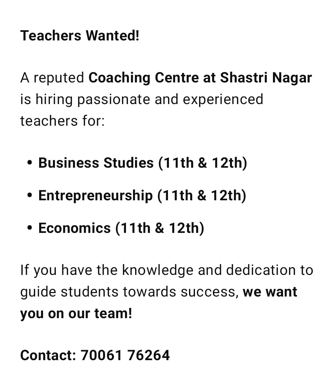A reputed Coaching Centre at Shastri Nagar is hiring passionate and experienced teachers for:
