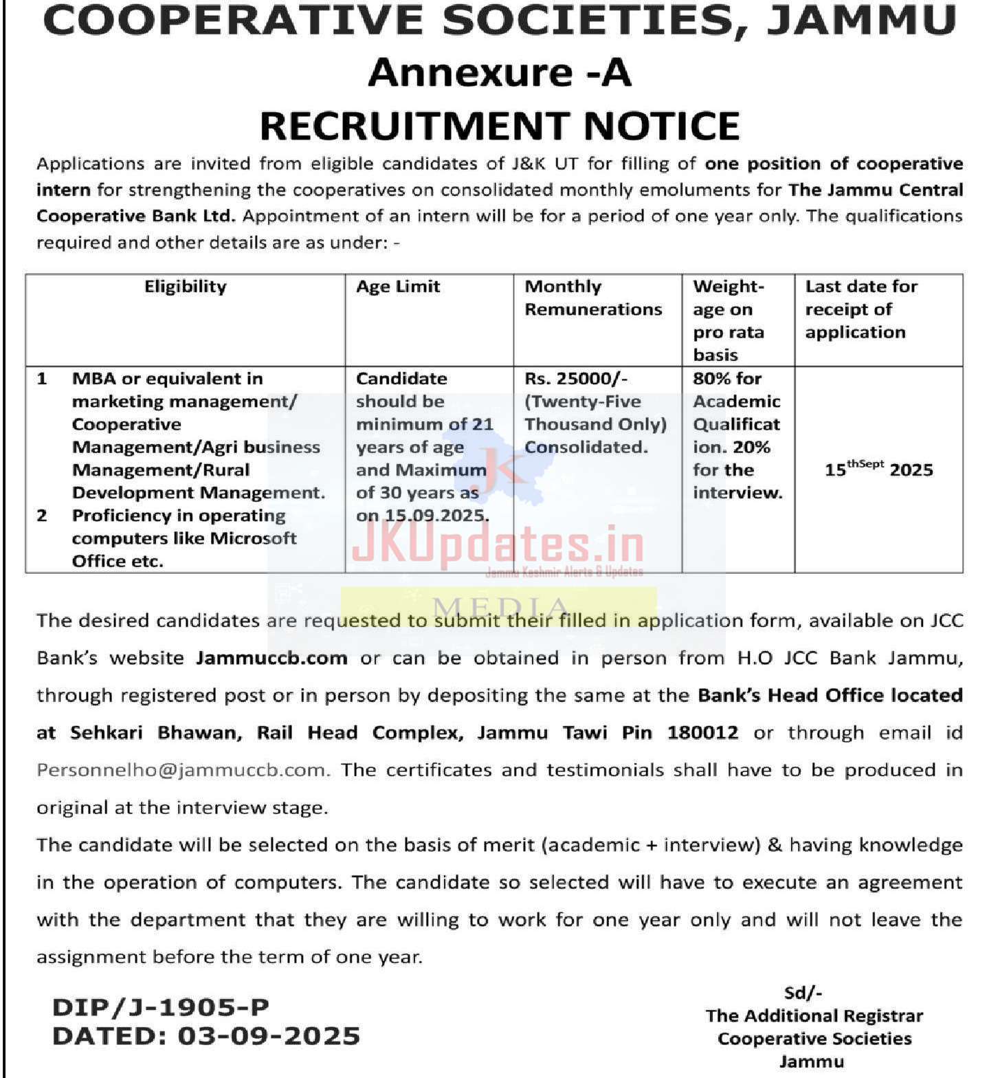 Applications are invited from eligible candidates of J&K UT for filling of one position of cooperative intern for strengthening the cooperatives on consolidated monthly emoluments for The Jammu Central Cooperative Bank Ltd.