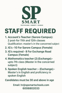 1. Account’s Teacher(Sarore Campus) :- 2 post-for 11th and 12th classes