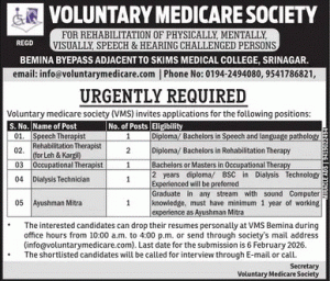 Interested candidates can drop their resumes personally at VMS Bemina during office hours from 10:00 a.m. to 4:00 p.m.