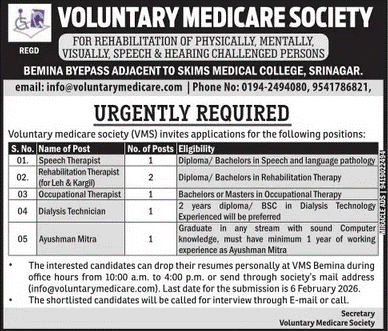 Voluntary Medicare Society (VMS) invites applications for the following positions: