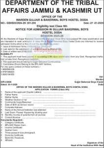All the Students of Gujjar Bakerwal Community of District Doda Who have passed 5th class examination and are interested to seek admission in class 6th in Gujjar Bakerwal Boys Hostel Doda are informed to receive admission forms which is free of cost the details are as under:-