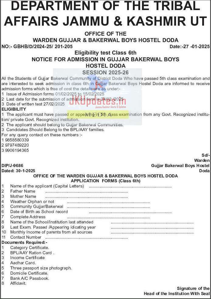 All the Students of Gujjar Bakerwal Community of District Doda Who have passed 5th class examination and are interested to seek admission in class 6th in Gujjar Bakerwal Boys Hostel Doda are informed to receive admission forms which is free of cost the details are as under:-