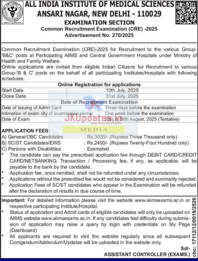 Common Recruitment Examination (CRE)-2025 for Recruitment to the various Group- ‘B&C’ posts at Participating AllMS and Central Government Hospitals under Ministry of Health and Family Welfare.
