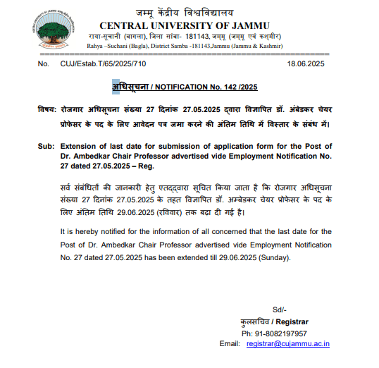 It is hereby notified for the information of all concerned that the last date for the Post of Dr. Ambedkar Chair Professor advertised vide Employment Notification No. 27 dated 27.05.2025 has been extended till 29.06.2025 (Sunday).