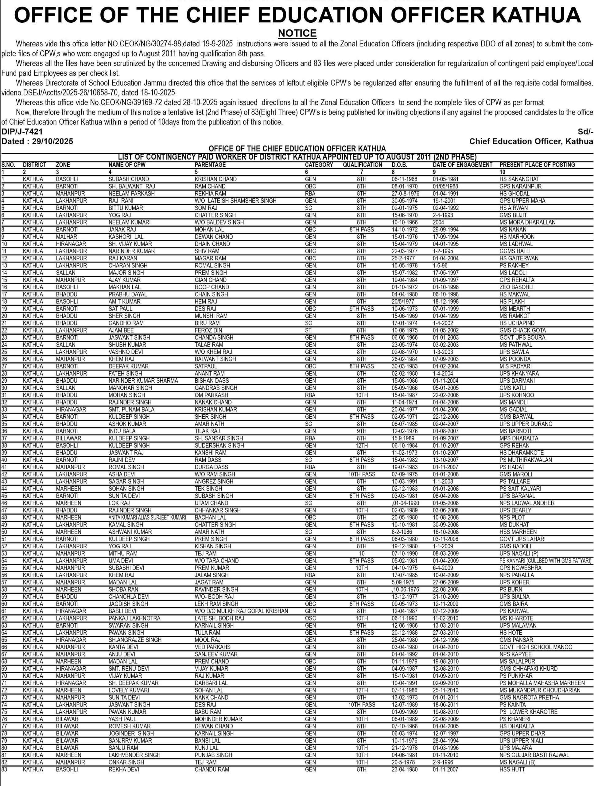 Now, therefore through the medium of this notice a tentative list (2nd Phase) of 83 (Eighty Three) CPWβs is being published for inviting objections if any against the proposed candidates to the office of Chief Education Officer Kathua within a period of 10 days from the publication of this notice.