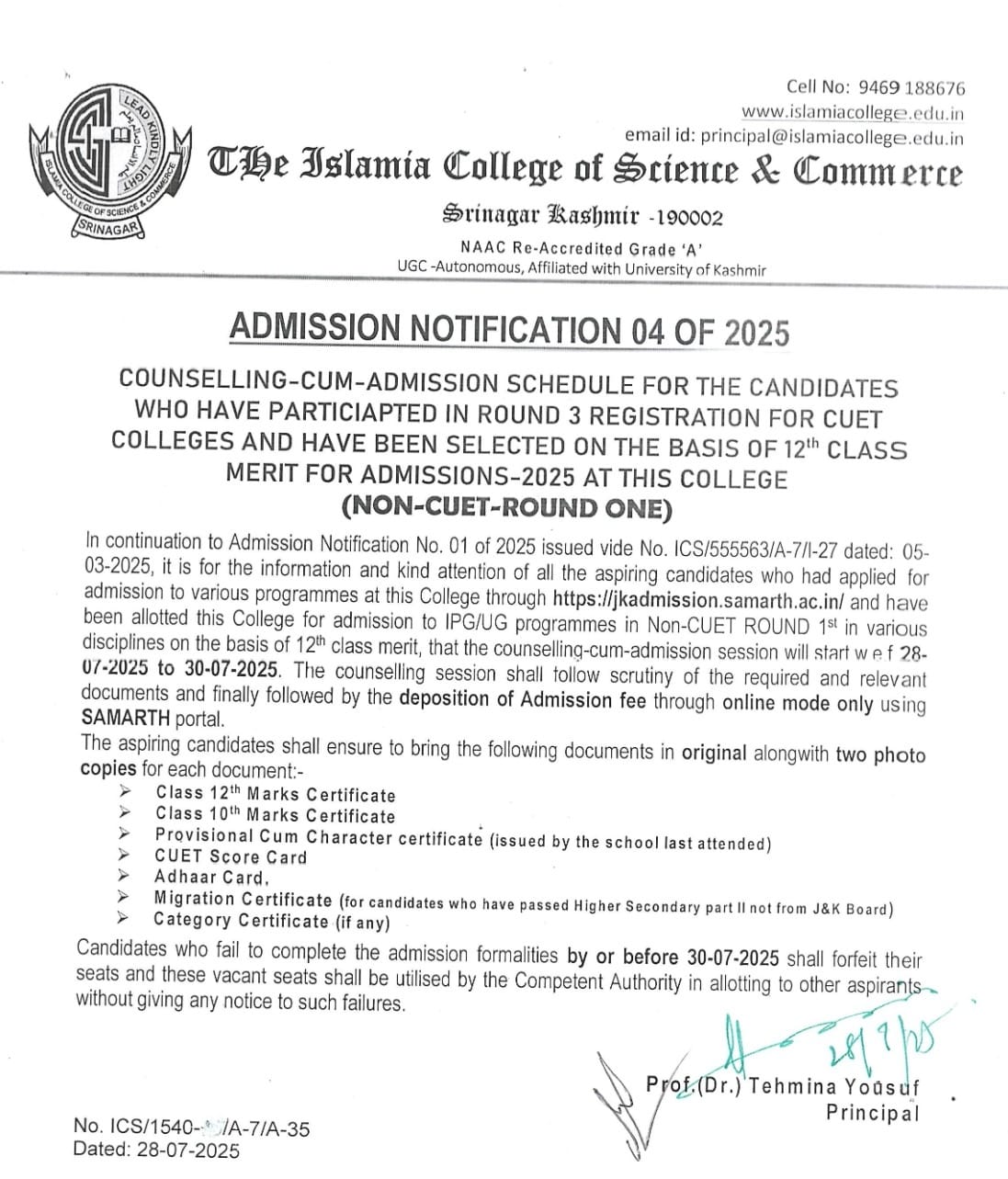 College – ICSC COUNSELLING-CUM-ADMISSION SCHEDULE FOR NON-CUET ROUND ONE