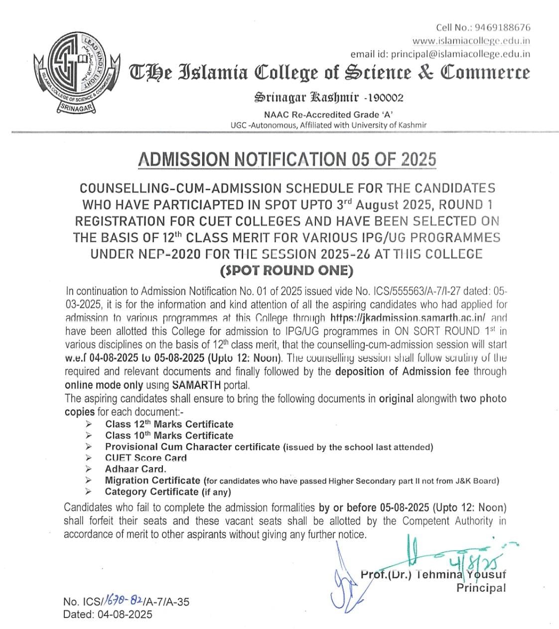 SPOT ROUND MERIT LIST 1 FOR UG / IPG PROGRAMMS FOR THE ACADEMIC SESSION 2025-26