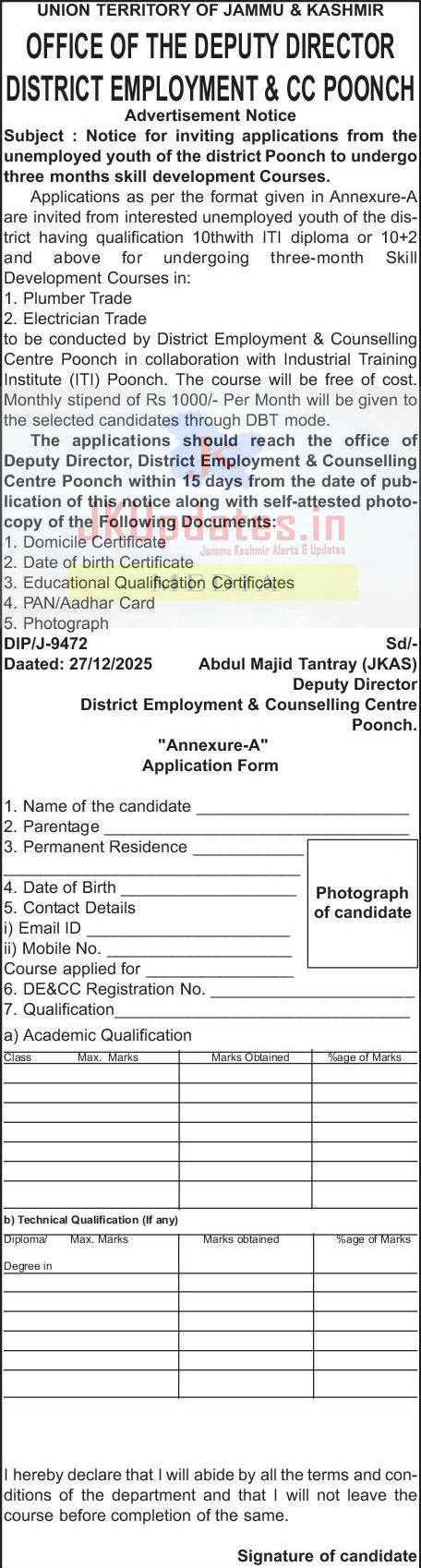 to be conducted by District Employment & Counselling Centre Poonch in collaboration with Industrial Training Institute (ITI) Poonch.