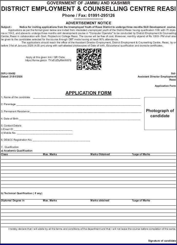 The applications should reach the office of the Assistant Director Employment, District Employment & Counselling Centre, Reasi, by or before 31st of January 2026 (4.00 pm) along with self-attested photocopies of Date of birth, Educational qualification and domicile certificates.