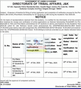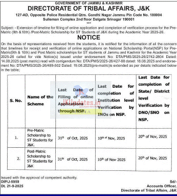 On the basis of representations received from the students, it is notified for the information of all the concern that timelines for receipt and verification of online applications on National Scholarship Portal(NSP) for Pre-Matric(9th & 10th) and Post Matric scholarships for ST students of Jammu and Kashmir for the Academic Year 2025-26 called for vide Notice(s) issued under endorsement No: DTA/PMS/2025-26/2742-2804 Dated: 14.08.2025 (post matric) read with corrigendum No: DTA/PMS/2025-26/427-88 dated: 18.08.2025 and endorsement No: DTA/PMS/2025-26/489-502 Dated: 19.08.2025(pre-matric)is extended as per details indicated below in the table;