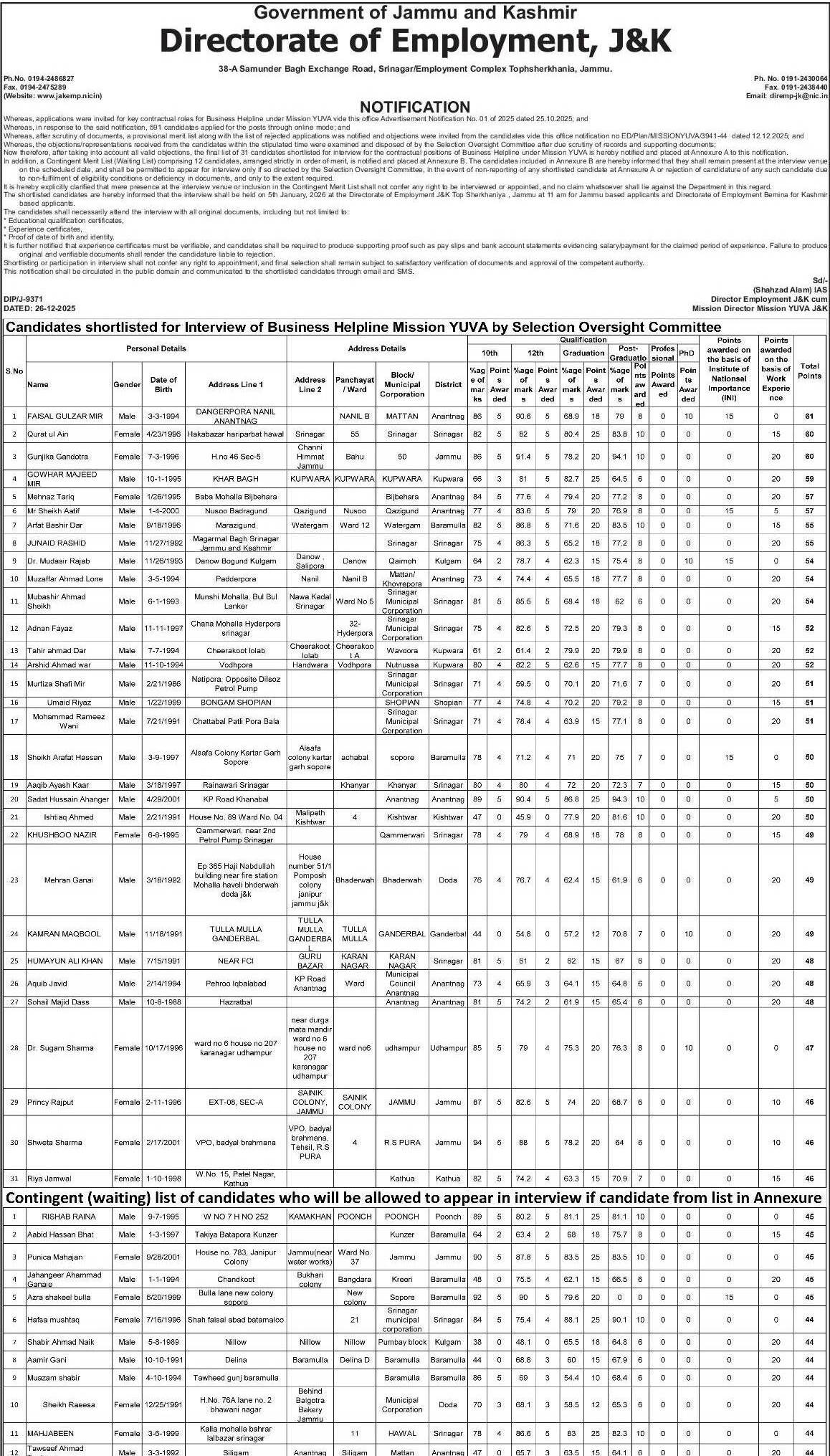 Now therefore, after taking into account all valid objections, the final list of 31 candidates shortlisted for interview for the contractual positions of Business Helpline under Mission YUVA is hereby notified and placed at Annexure A to this notification.