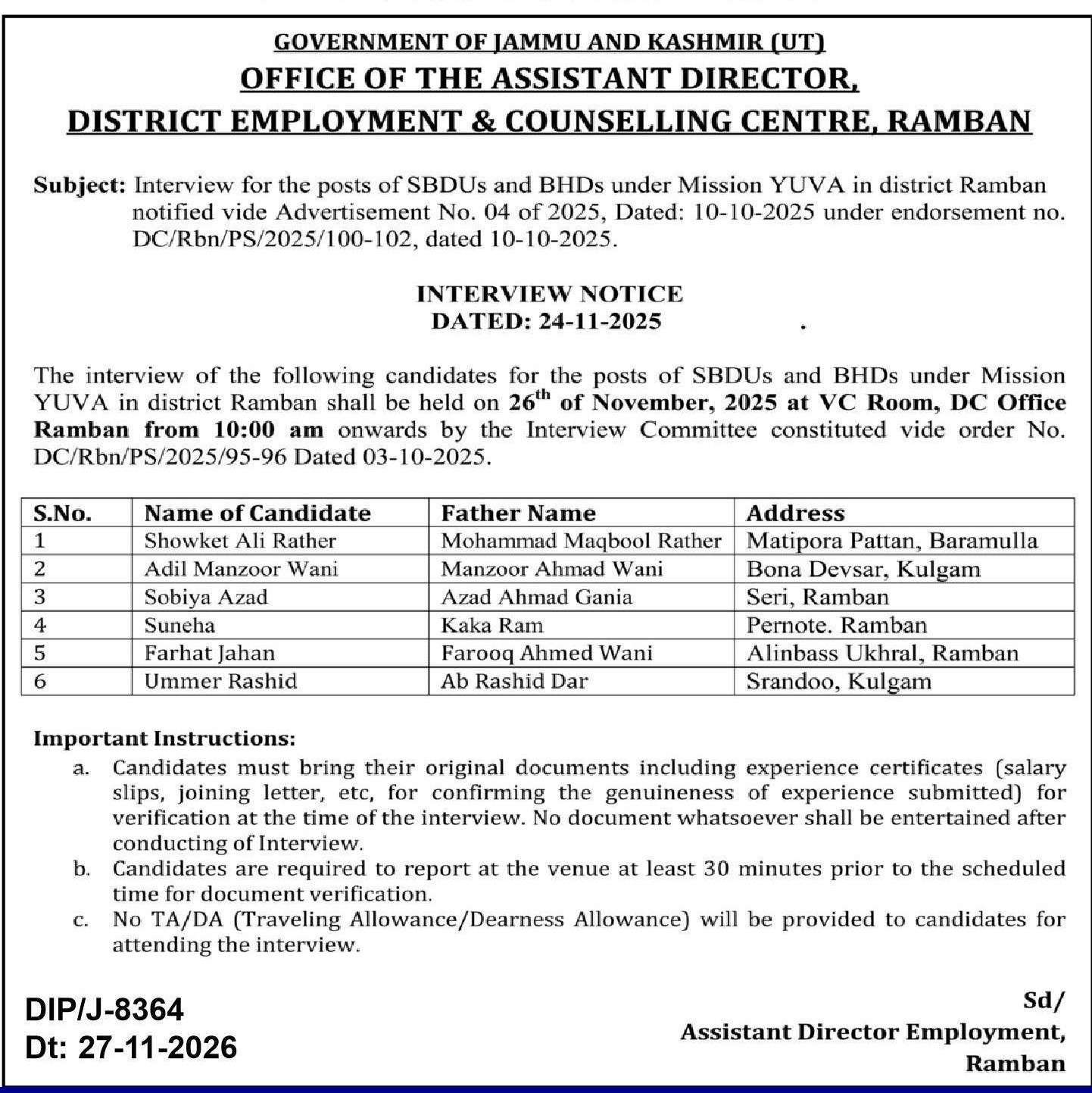 Subject:- Interview for the posts of SBDUs and BHDs under Mission YUVA in district Ramban notified vide Advertisement No. 04 of 2025, Dated: 10-10-2025 under endorsement no. DC/Rbn/PS/2025/100-102, dated 10-10-2025.