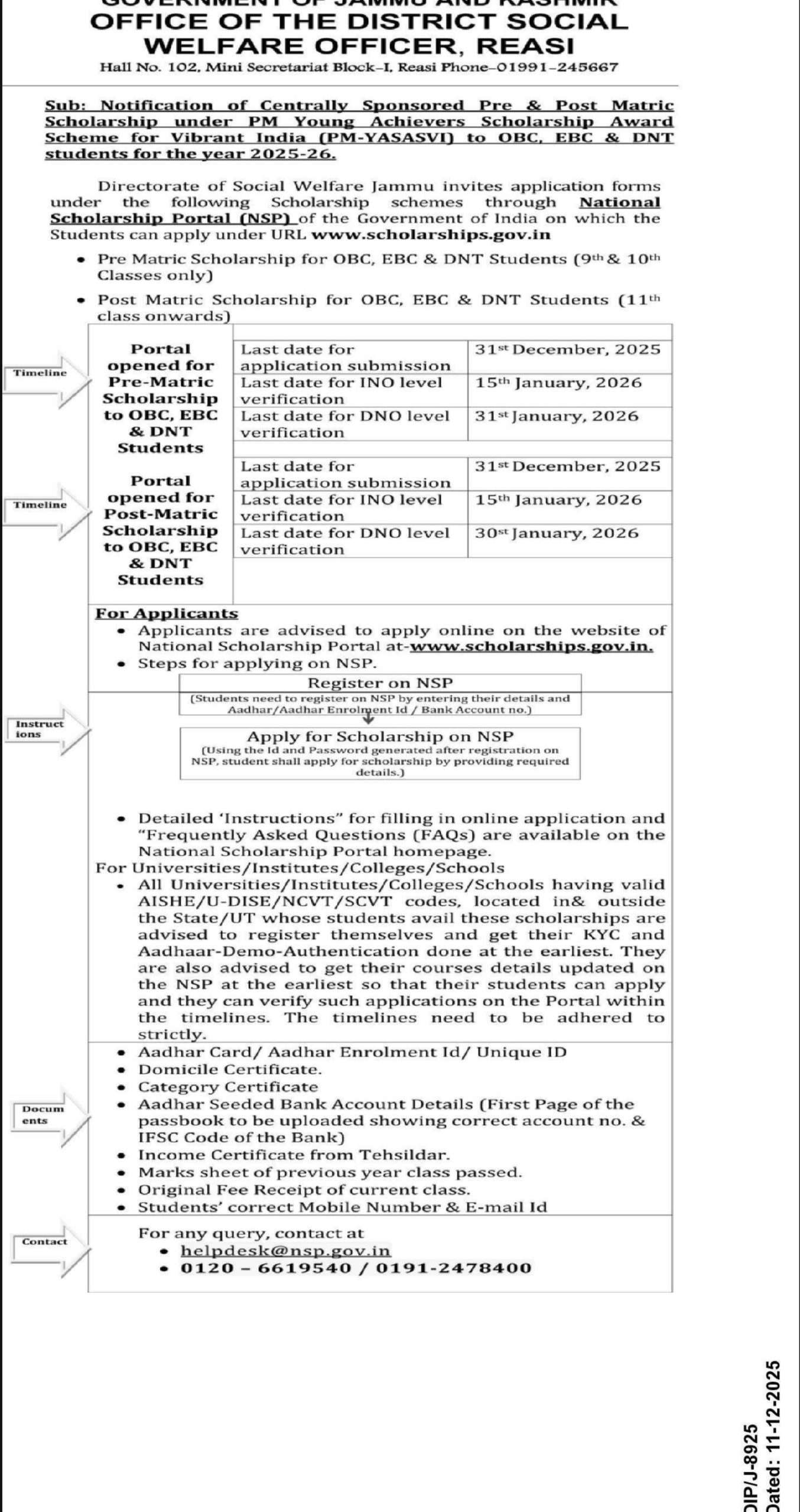 The Directorate of Social Welfare Jammu invites application forms under the following scholarship schemes through the National Scholarship Portal (NSP) of the Government of India, available at www.scholarships.gov.in.