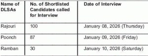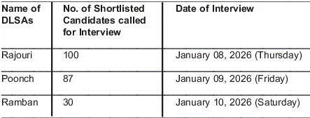 All the shortlisted candidates are advised to appear for the interview/interaction in the office of District Legal Services Authority concerned (District Court Complex) at 11:00 AM on the dates mentioned above. No separate call letters shall be issued. The interview shall be conducted by the Committee comprising of the Chairperson, DLSA concerned along with the Member Secretary, J&K Legal Services Authority,