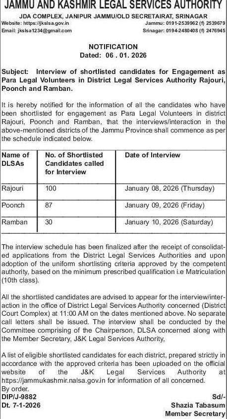 It is hereby notified for the information of all the candidates who have been shortlisted for engagement as Para Legal Volunteers in district Rajouri, Poonch and Ramban, that the interviews/interaction in the above-mentioned districts of the Jammu Province shall commence as per the schedule indicated below: