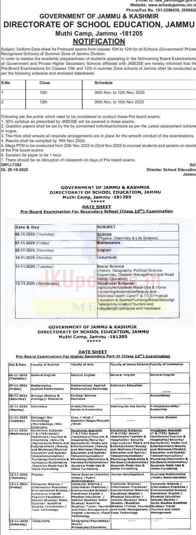 In order to assess the academic preparedness of students appearing in the forthcoming Board Examinations, all Government and Private Higher Secondary Schools affiliated with JKBOSE are hereby informed that the Pre-Board Examinations for Classes 10th and 12th in summer Zone schools of Jammu shall be conducted as per the following schedule and enclosed date sheets :